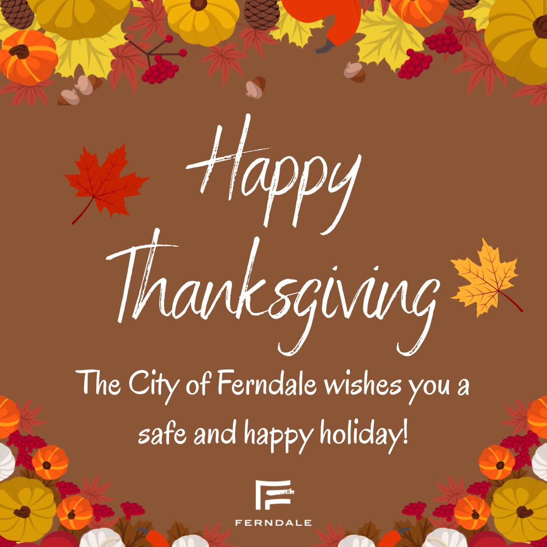 City Hall is closed on Thursday, November 26, 2026, in observance of Thanksgiving Day. Garbage and recycling will be delayed by one day for the remainder of the week. Parking is free in Downtown Ferndale.