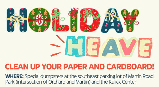 If your holiday waste is reaching epic proportions, join the Holiday Heave! From Monday, December 22, 2025, to Friday, January 2, 2026, drop off empty, flattened boxes, wrapping paper, paper gift bags, and holiday cards at the special dumpsters in the Martin Road Park and Kulick Center parking lots.