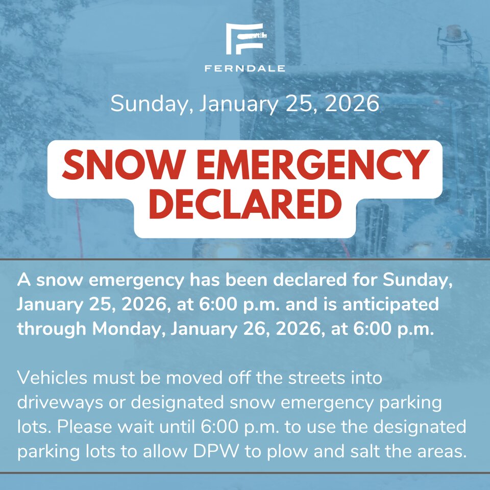 A snow emergency has been declared for Sunday, January 25, 2026, at 6:00 p.m. and is anticipated through Monday, January 26, 2026, at 6:00 p.m.