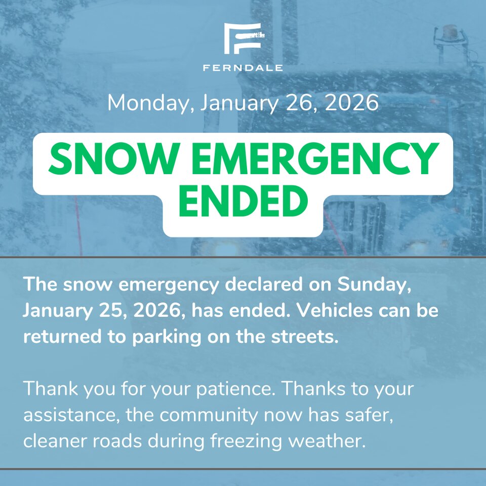 The snow emergency that started on Sunday, January 25, 2026, is now over. Vehicles can be moved back to the streets.