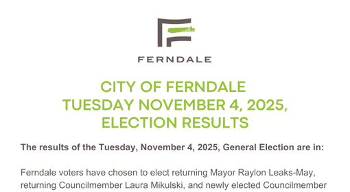 The results of the Tuesday, November 4, 2025, General Election are in. Ferndale voters have chosen to elect returning Mayor Raylon Leaks-May, returning Councilmember Laura Mikulski, and newly elected Councilmember Eddie Sabatini.