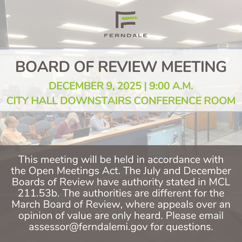 The December Board of Review Meeting is on Tuesday, December 9, 2025, at 9:00 a.m. in the Downstairs Conference Room at Ferndale City Hall, located at 300. E Nine Mile Road.