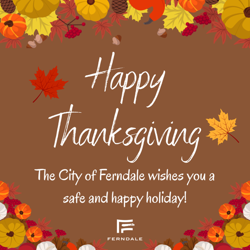 City Hall is closed on Thursday, November 26, 2026, in observance of Thanksgiving Day. Garbage and recycling will be delayed by one day for the remainder of the week. Parking is free in Downtown Ferndale.