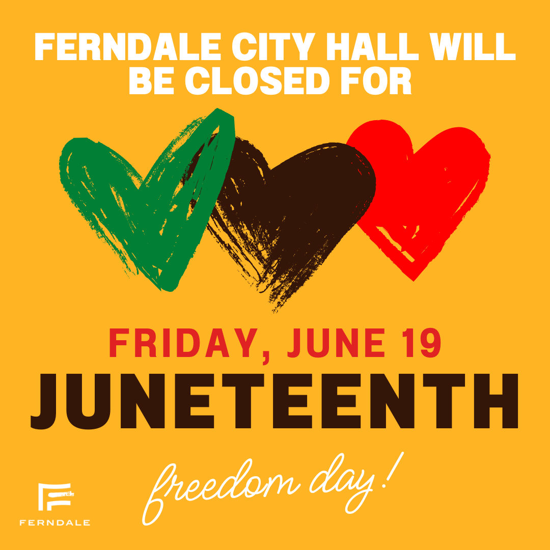City Hall is closed on Friday, June 19, 2026, in observance of Juneteenth. Garbage and recycling collection will not be affected. Parking is free in Downtown Ferndale.