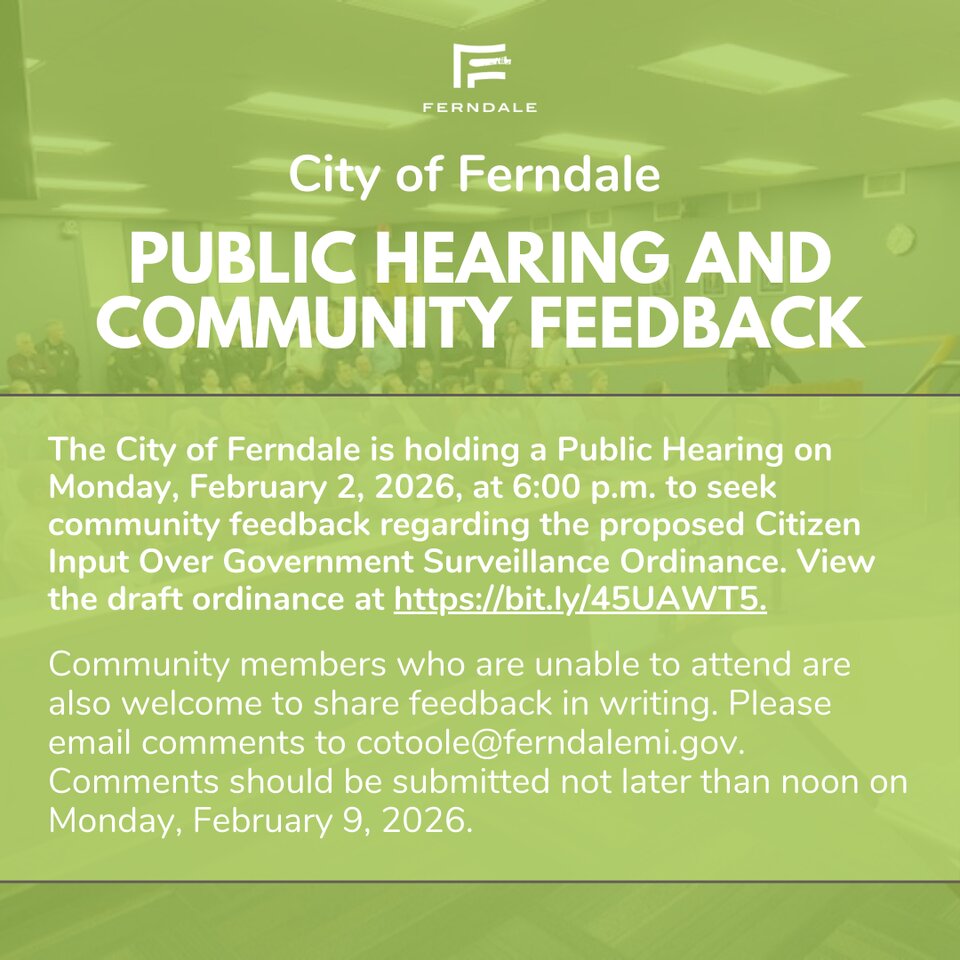 The City of Ferndale is holding a Public Hearing on Monday, February 2, 2026, at 6:00 p.m. to seek community feedback regarding the proposed Citizen Input Over Government Surveillance Ordinance. View the draft ordinance at https://bit.ly/45UAWT5.