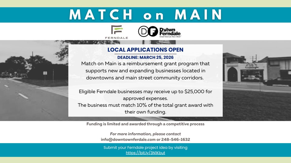 The 2026 𝗠𝗮𝘁𝗰𝗵 𝗼𝗻 𝗠𝗮𝗶𝗻 application is open! This is a fantastic small business grant program facilitated by the MEDC MiPlace and administered at the local level by the Ferndale Downtown Development Authority (DDA) and the City of Ferndale.