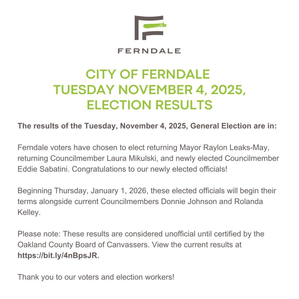 Ferndale voters have chosen to elect returning Mayor Raylon Leaks-May, returning Councilmember Laura Mikulski, and newly elected Councilmember Eddie Sabatini. Congratulations to our newly elected officials!
